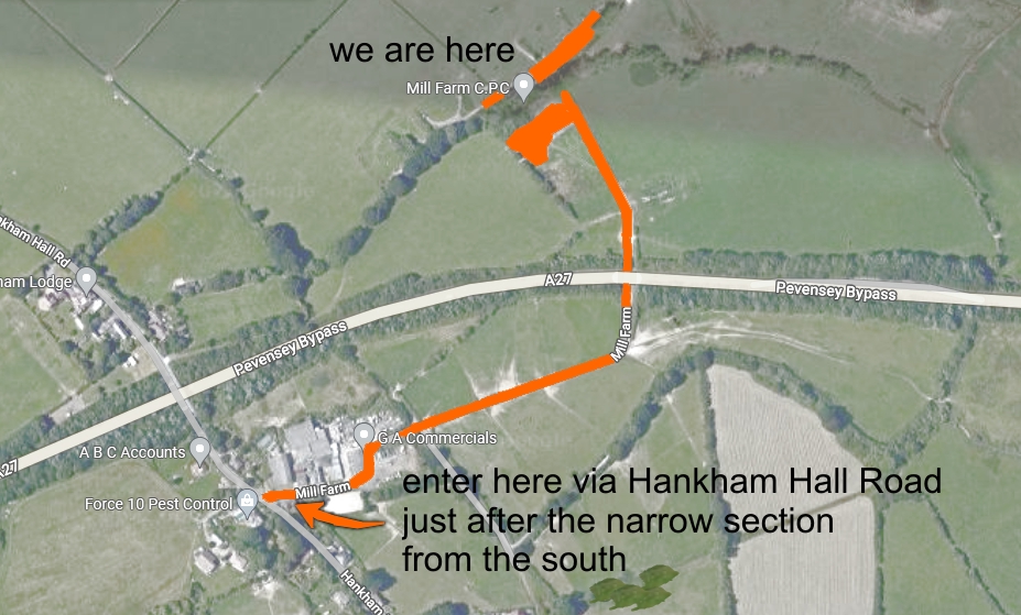 From Hastings/Bexhill direction A259 to towards Pevensey From the M&S/BP roundabout take the second exit to Pevensey, straight across the traffic lights, round Pevensey Castle, through Westham, straight across the first mini roundabout and turn right at the second mini roundabout onto Gallows Lane, straight across the crossroads and up the hill (Hankham Hall Road). Right on the brow of the hill on the right hand side is the farm entrance. Turn in here.